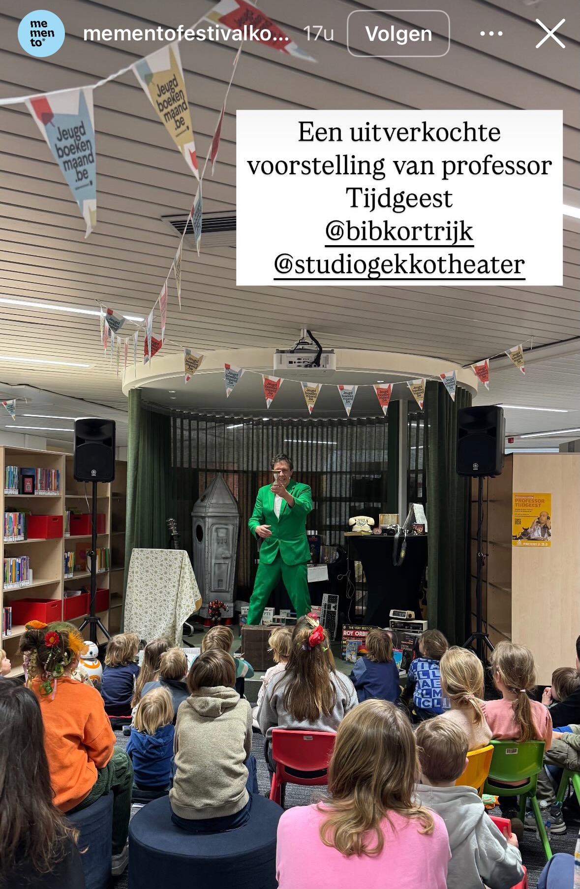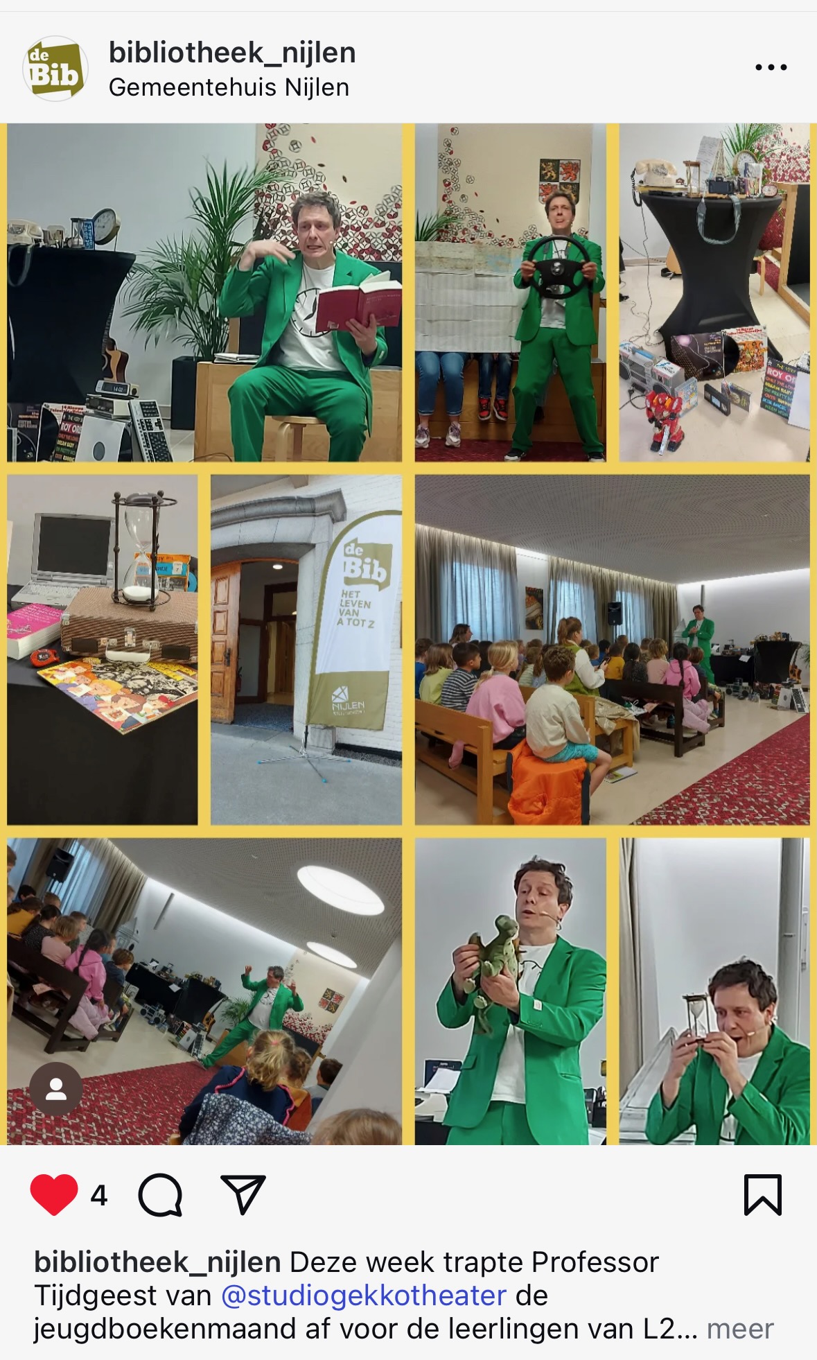 ‘Zowel voor de kinderen als voor de leerkrachten was Professor Tijdgeest een heel geestige en nostalgische ontdekking, die ons ook allemaal deed nadenken, over vroeger, nu én de toekomst. In de klassen werd hier nog mee verder gewerkt. Dank voor jullie komst.’(Directeur Wouter)